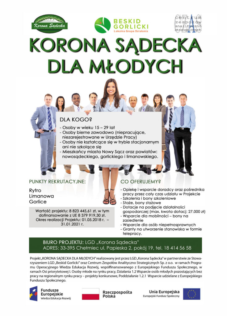 Fundacja Silver Economy w dniu 24.08.2020r zawarła umowę nr 07/KSDM/2020/1 z LGD ,, KORONA SĄDECKA” na opracowanie indywidualnych planów działania dla 45 uczestników /- czek projektu ,, Korona Sądecka dla młodych” w zakresie doskonalenia zawodowego uczestników. W ramach tego działania zostanie zrealizowanych maksymalnie 270 godzin wsparcia. Identyfikacja potrzeb uczestników/-czek jest realizowana zgodnie ze Standardami usług obowiązujących w ramach naboru konkursowego POWER.01.02.01-IP.15-12-008/17 w ramach Programu Operacyjnego Wiedza Edukacja Rozwój 2014-2020 Priorytetu I Osoby młode na rynku pracy Działanie 1.2 Wsparcie osób młodych pozostających bez pracy na regionalnym rynku pracy – projekty konkursowe , Poddziałanie 1.2.1 Wsparcie udzielane z Europejskiego Funduszu Społecznego.