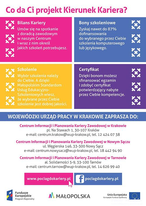 Projekt Wojewódzkiego Urzędu Pracy w Krakowie pn. „Kierunek Kariera” jest realizowany w ramach Regionalnego Programu Operacyjnego Województwa Małopolskiego 2014-2020, Działanie 10.3 „Rozwój kompetencji i umiejętności osób dorosłych” współfinansowany przez Unię Europejską ze środków Europejskiego Funduszu Społecznego.