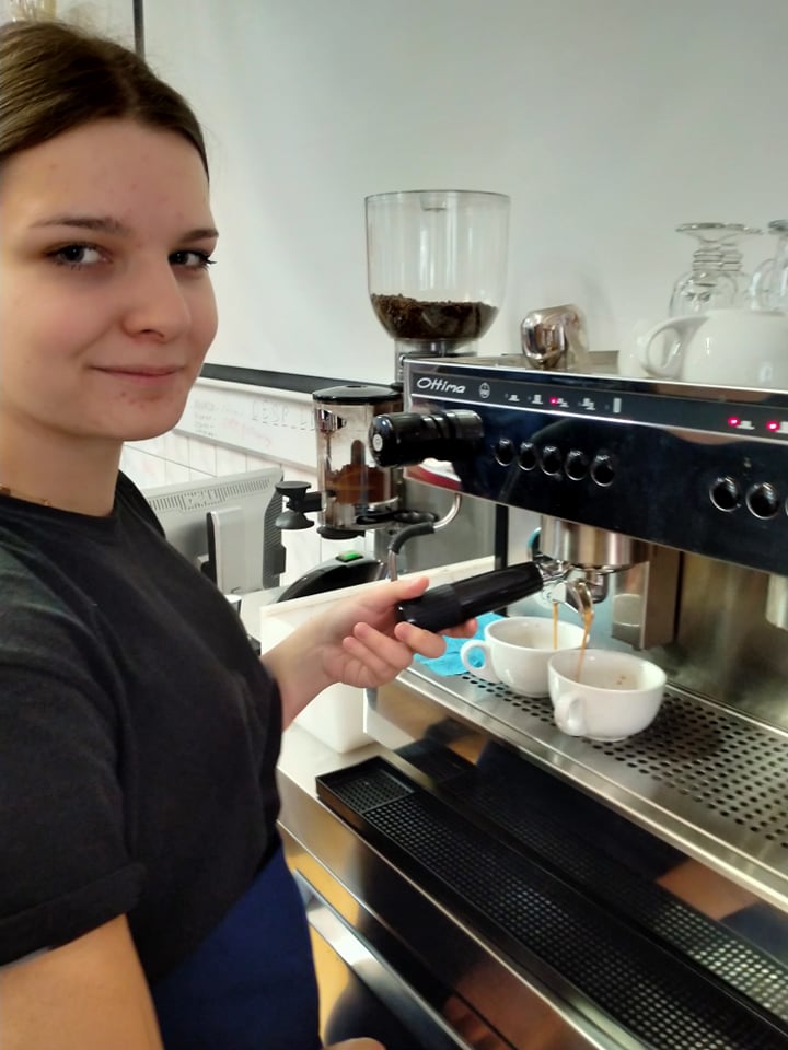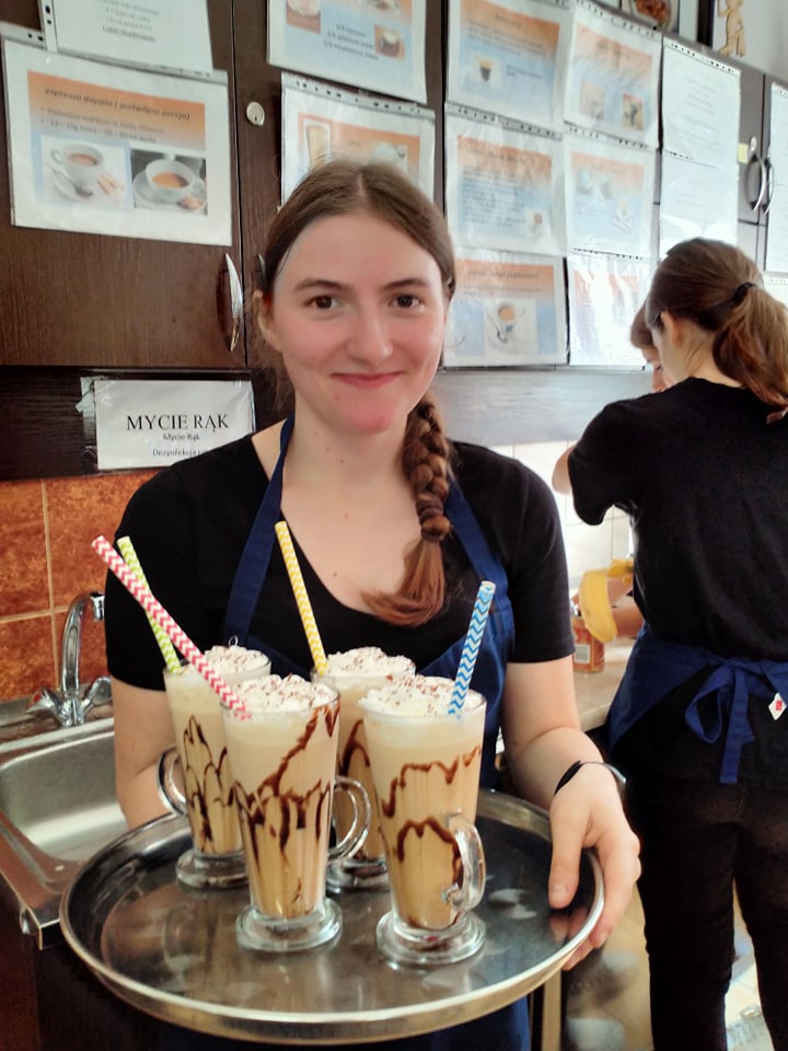 Przeprowadzone zajęcia nastawione były głównie na praktykę – tak by wykształcić u uczestników/-czek najwyższy poziom umiejętności zawodowych z zakresu baristyki (by każda z osób uczestniczących w kursie była w stanie stworzyć kawę łączącą w sobie niezapomniane walory smakowe, elegancki wygląd oraz fantazyjny sposób podania). Praktyczny aspekt przeprowadzonych zajęć obrazują najlepiej następujące fotografie uczniów i uczennic w trakcie pracy: