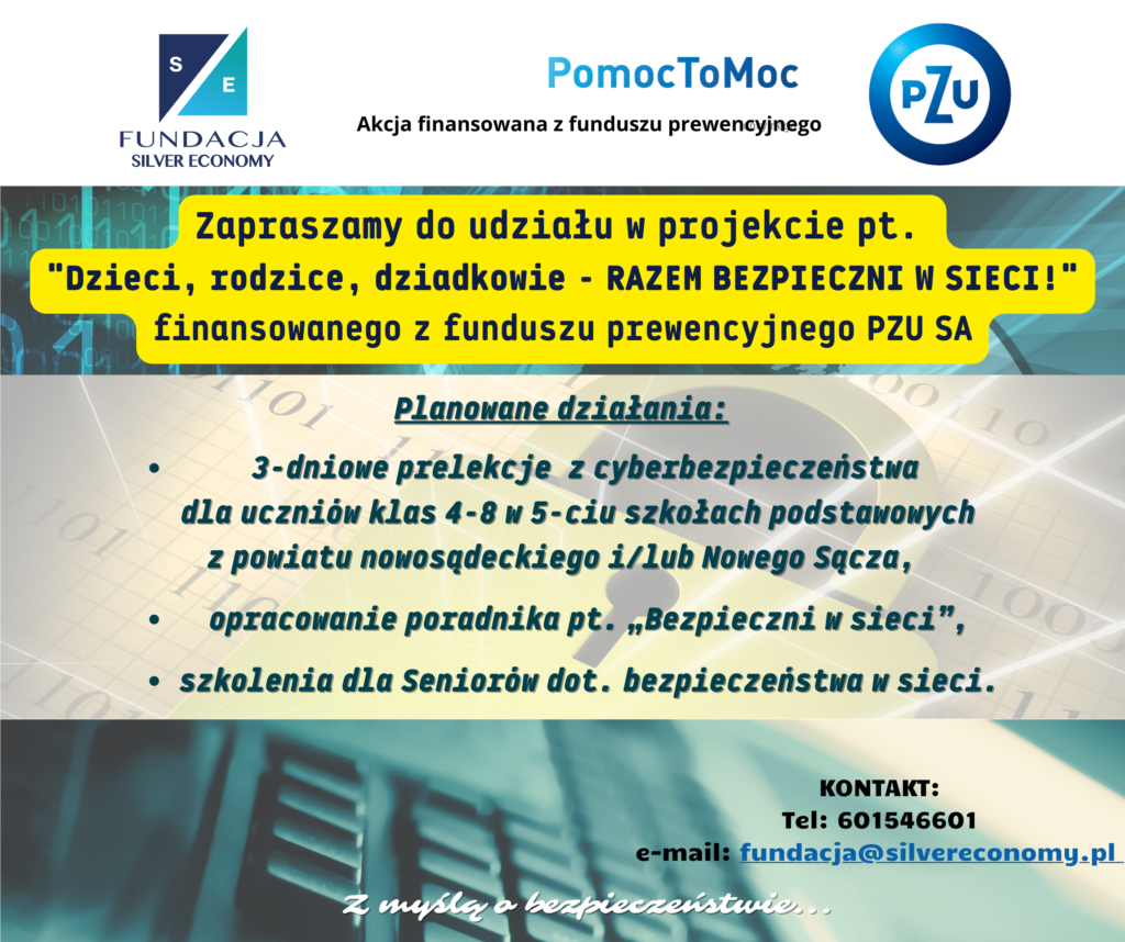 „Pomoc to moc”! Zapraszamy do udział w projekcie pt. „Dzieci, rodzice, dziadkowie – RAZEM BEZPIECZNI W SIECI” finansowanym w ramach akcji prewencyjnej PZU SA.