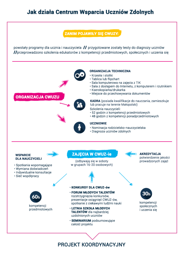 Testy diagnostyczne są przeprowadzane w roku szkolnym poprzedzającym rok szkolny zajęć w Centrach Wsparcia Uczniów Zdolnych. Testy diagnostyczne mają charakter psychologiczny i zostały opracowane do etapu edukacyjnego i obszaru kształcenia co oznacza, ze ten sam test piszą uczniowie wszystkich klas danego etapu – uczniowie klas IV-V szkoły podstawowej piszą test dla szkoły podstawowej etap I, uczniowie klas VI-VII szkoły podstawowej piszą test dla szkoły podstawowej etap II, uczniowie szkoły ponadgimnazjalnej/ponadpodstawowej piszą testy przeznaczone dla tego etapu.